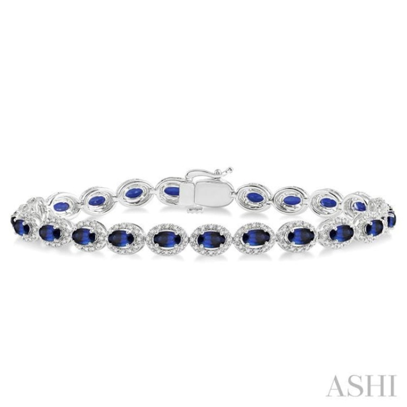 A glamorous Sapphire and diamond precious stone bracelet, this offers sophistication even to the simplest of evening attires. It features 23 oval cut 5×3 MM Sapphires, studded on oval mounts, running all along the length of the bracelet. 12 prong set round cut diamonds surround each of these Sapphires, totaling 276 diamonds encircling the 23 oval cut Sapphires. An open box clutch closure secures the precious stone bracelet, which is styled in 14 karat white gold. Total diamond weight is 1 1/10 ctw.