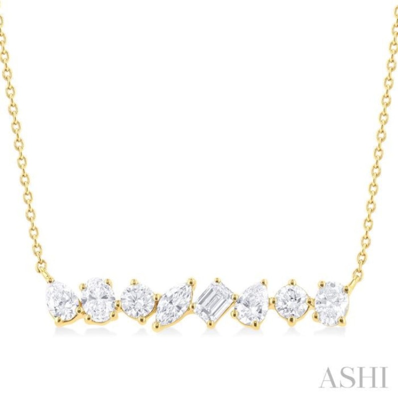 A necklace from the scatter diamond collection, this offers visual appeal, just like the other jewelry pieces in the scatter setting. In scatter jewelry, there is no uniform setting. Instead, diamonds are placed randomly to create a unique look. In this fashionable necklace are seen different diamond cuts, which include a fancy prong set round, oval, pear, marquise and emerald cut diamonds. These are placed randomly in a straight line, like a long pendant. A CAT25 chain completes the necklace, which is crafted in 14 karat yellow gold. Total diamond weight is 1 1/10 ctw.
