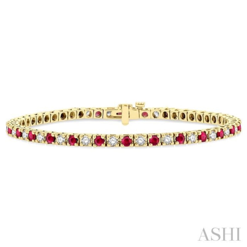 A classy precious gemstone tennis bracelet, this offers aesthetic appeal. It features a tightly linked square box shape links, with rubies and diamonds alternatingly accenting the box links. There are a total of 56 box links, with 28 each for the diamonds and rubies. A 2.5MM round cut ruby each, total 28, and a prong set round cut diamond each, total 28, embellish the box links. A push-release open box clasp secures the tennis bracelet, which is styled in a polished rhodium finish 14 karat yellow gold. Total diamond weight is 1 1/2 ctw.