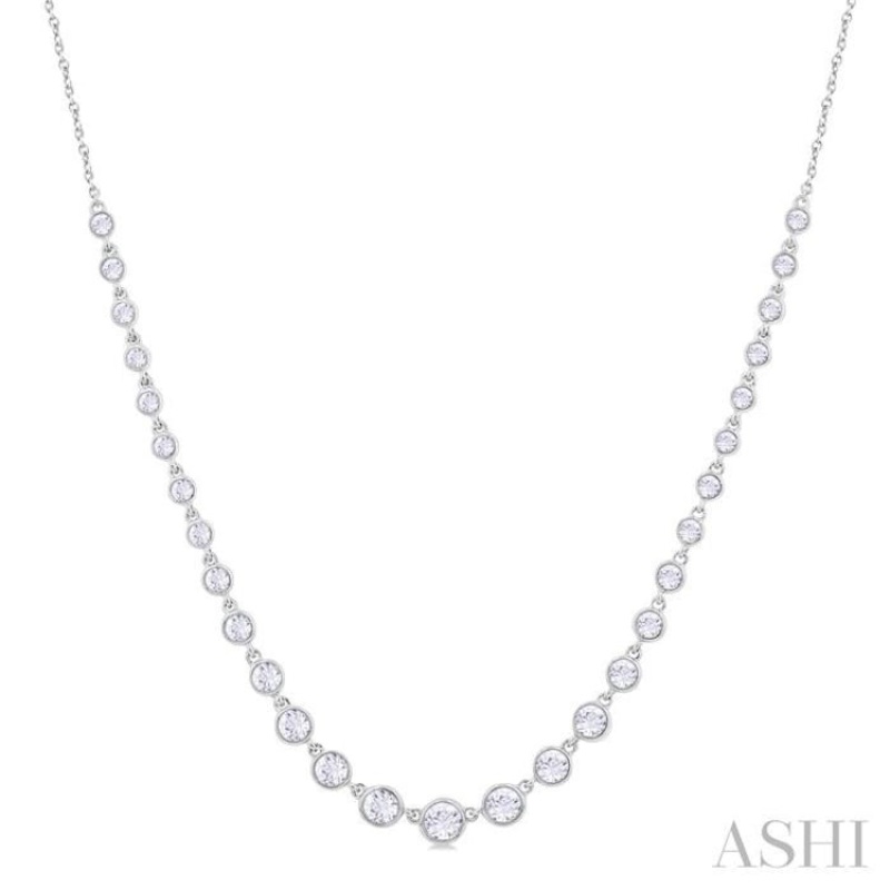 This classy diamond tennis necklace is designed to make a statement, effortlessly enhancing any attire with its sophisticated sparkle. The necklace showcases a stunning halfway adorned layout of graduated bezel set round cut diamond links. At its heart, a 1/8 ctw bezel set round cut diamond commands attention, beautifully flanked by 8 graduated bezel set round cut diamonds on each side. This graceful gradient is seamlessly followed by a row of 7 each same-sized bezel set round cut diamonds, creating a harmonious and dazzling effect along the neckline. Completed with a Catchain30 Spool, the diamond tennis necklace is styled in a rhodium finish 14 karat white gold. Total diamond weight is 1 1/4 ctw.