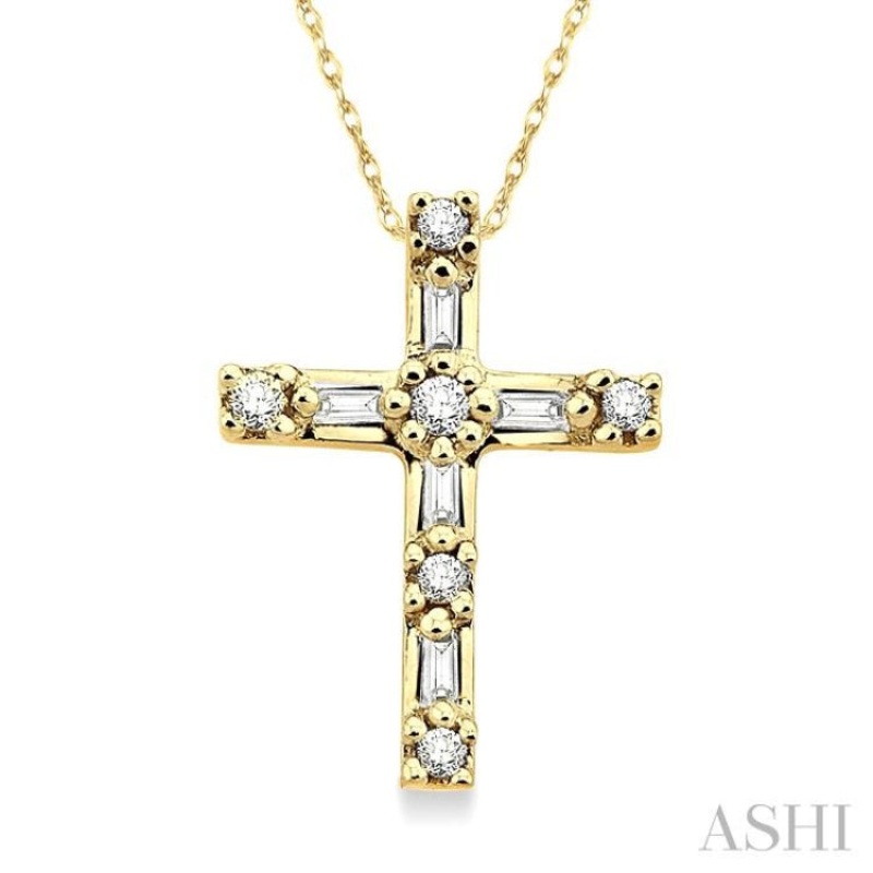 Gift this elegant diamond cross pendant to your beloved; a wonderful relic of faith that holds so many beliefs. This gorgeous pendant is graced by 5 brilliant baguette cut diamonds and 6 shimmering round cut diamonds set on lustrous 10 karat yellow gold. A