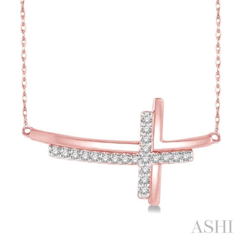1/10 Ctw Reclining Double Cross Round Cut Diamond Pendant With Link Chain in 10K Rose Gold