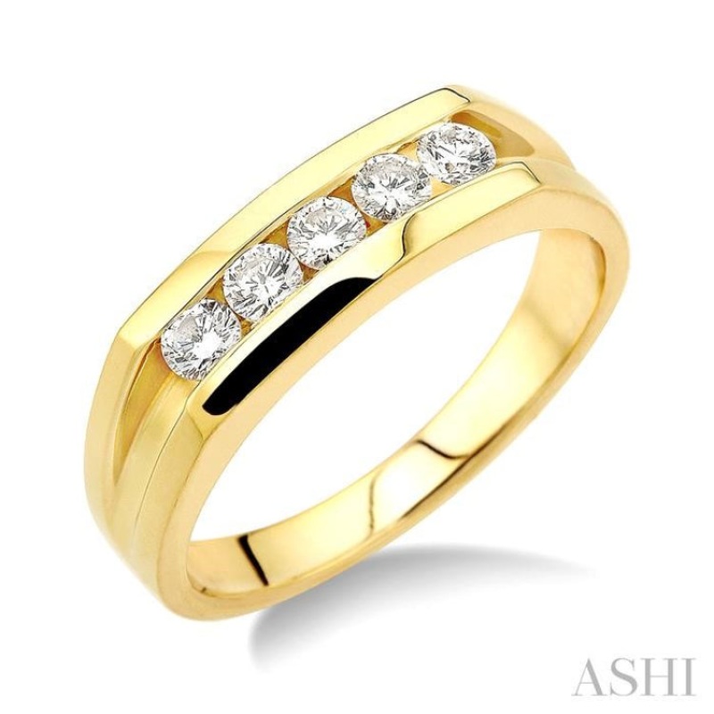 An attractive diamond ring for men, this makes for a lovely exchange ring or a fashion accessory to include to one’s collection. It features a rounded flat top, with a channeled center, where round cut diamonds are neatly housed. There is a 1/8 ctw channel set round cut diamond in the center, with 2 each channel set 1/10 ctw round cut diamonds flanking it, a total of 5 diamonds altogether. The men’s diamond ring is sculpted in 14 karat yellow gold. Total diamond weight is 1/2 ctw.