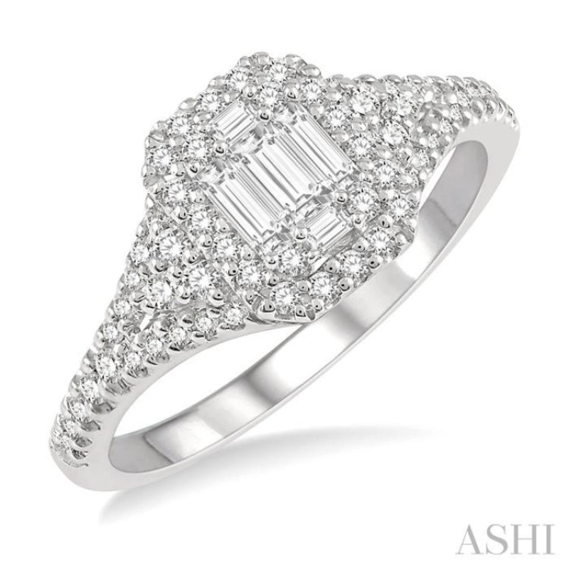 Closely arranged diamonds give this ring an illustrious look that makes you want it instantly. With 5 baguette diamonds totalling 1/5 ct adorning the centre and four invisible set diamonds filling the corners, the centre mount is also decorated with 18 micro wall set round cut diamonds bordering it. A total of 1/3 ct round cut diamonds is embellished on the ring, including 30 micro wall and 6 prong set diamonds on the shank. The elegant ring is styled in 14 karat white gold. Total diamond weight is 1/2 ctw.