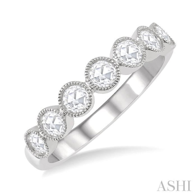 Refined circular discs join together to make this lovely lattice stack band. The ring can be worn stacked with other bands or by itself, as you prefer. 7 rose cut round diamonds in three different sizes decorate the disc accent on the ring. Three bezel set diamonds of the same size are flanked with a smaller diamond each on both sides, with another two small ones tailing them. A milgrain finish highlights the circular mounts that hold the diamonds. The rose-cut ring is framed in 14 karat white gold. Total diamond weight is 1/2 ctw.