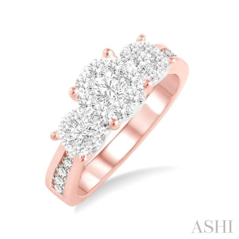 This captivating lovebright diamond ring will make your love more special for her. Beautifully crafted in cool 14 karat rose and white gold, this ring features a trios of framed round diamond arrays arranged side-by-side along the shank. Additional diamond