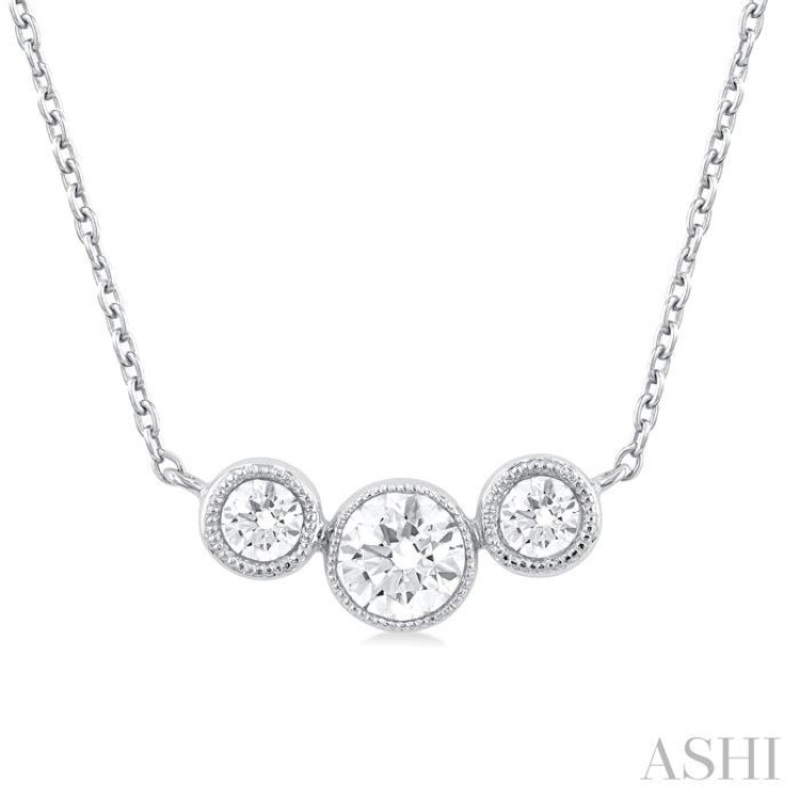Discover the timeless symbolism of love with this dainty diamond necklace, a meaningful representation of enduring love and commitment. It is perfect for celebrating milestones or as a heartfelt gift that captures the essence of cherished memories. The necklace features a triple circular mount design, symbolizing the journey of a couple’s relationship through the past, present, and future. At the heart of the piece, a 1/3 ctw bezel set round cut diamond represents the present, flanked by a 1/10 ctw bezel set round cut diamond each, symbolizing the past and future of the couple’s love story. A delicate milgrain border enhances the beauty of the diamonds. The necklace is completed with a Cat-25 chain and secured by a lobster clasp closure. It is crafted in a polished rhodium finish 14 karat white gold. Total diamond weight is 1/2 ctw.