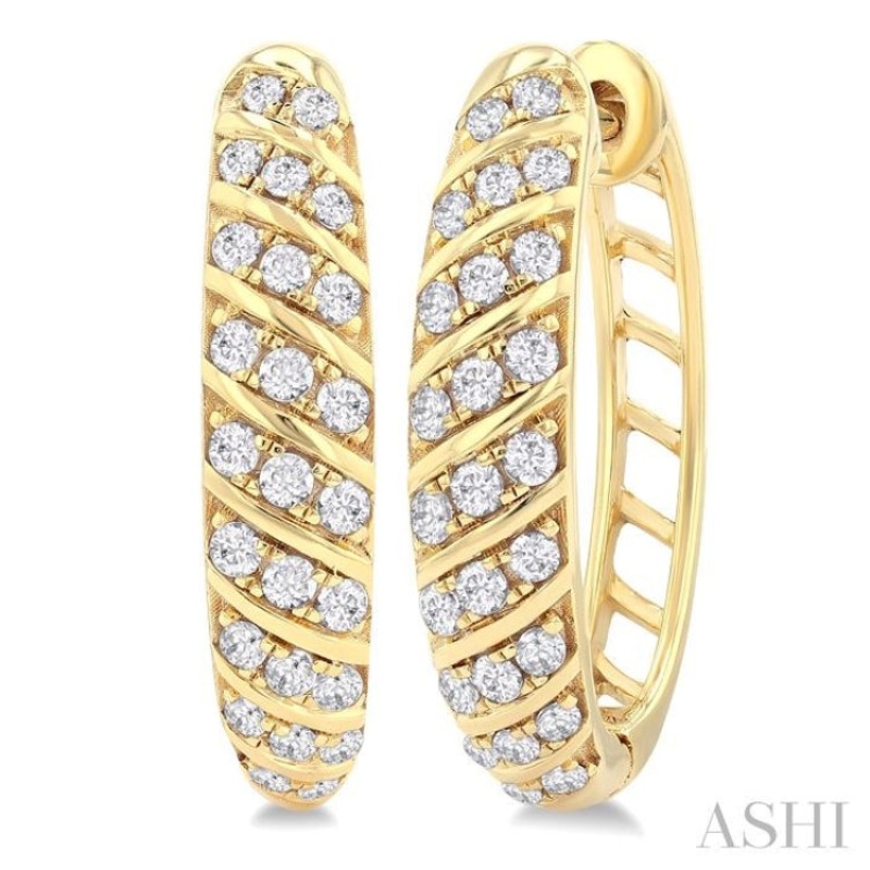 Add a touch of sophistication to any ensemble, with these exquisite diamond fashion hoop earrings, perfect for making a chic statement on any occasion. Featuring an enchanting ribbed swirl design, these hoops elegantly alternate between sleek plain gold and diamond-encrusted swirls along the hoop front. Each earring is adorned with 25 microscopic split prong set round cut diamonds, totaling 50 diamonds across the pair, adding a brilliant sparkle to their stylish design. Framed in 14 karat yellow gold, these diamond fashion hoop earrings effortlessly blend timeless elegance with contemporary flair. Total diamond weight is 1/2 ctw.