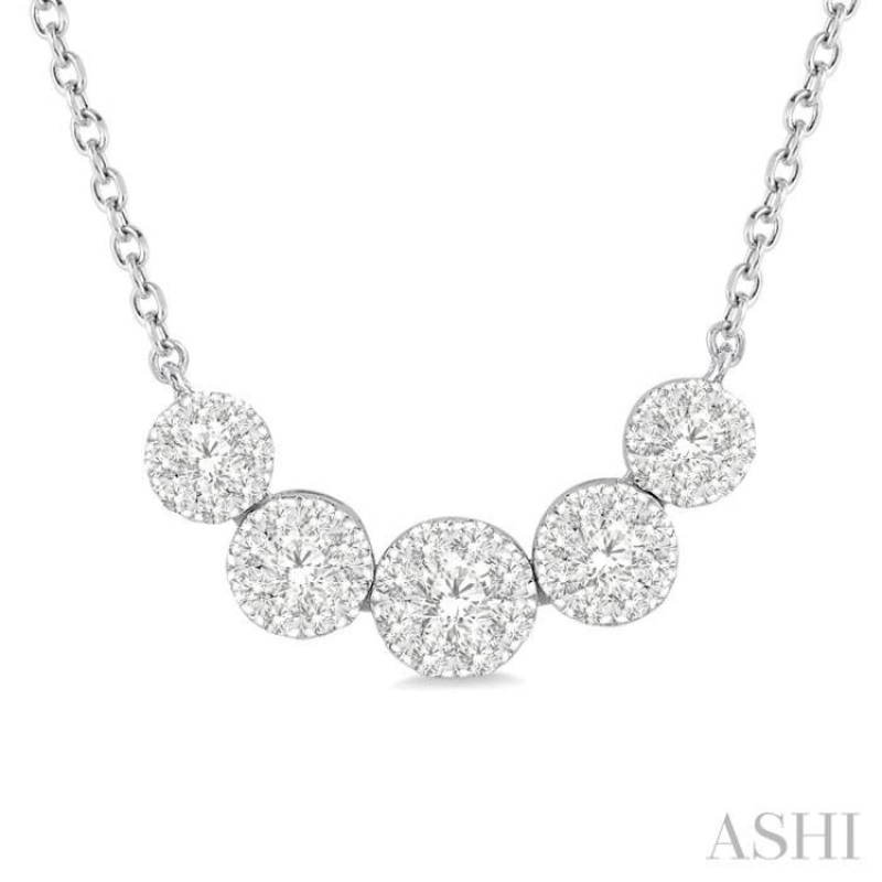 This scintillating, fresh and timeless diamond Lovebright necklace will complement your sweetheart’s look and style. Fashioned on luminous 14 karat white gold With a cat chain and a lobster lock, this lavish necklace showcases shimmering 45 round cut diamonds that are set in a beautiful complementary array motif. Diamonds are perfectly invisible set. Fastens with a secure clasp. Total diamond weight is 1/2 Ctw.
