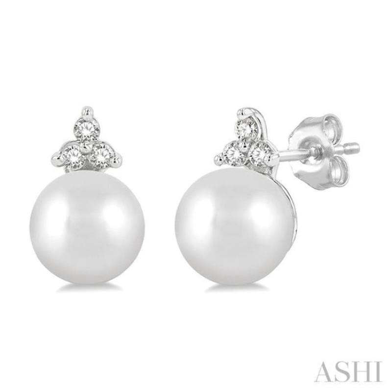 Cultured Pearls studs are almost ideal for any occasion, be it a casual, semi-casual or formal get-together or meeting. These Cultured Pearls and diamond stud earrings from the new and favorite petite collection, make for a good choice. They are simple yet elegant in look. The earrings feature a 5.5 MM Cultured Pearls each, total 2, with 3 each, total 6, prong set round cut diamonds crowning it in a triangular layout. An easy to slip-on push-back earnut closure secures the earrings. The fashion stud earring is molded in a rhodium finish 10 karat white gold. Total diamond weight is 1/20 ctw.