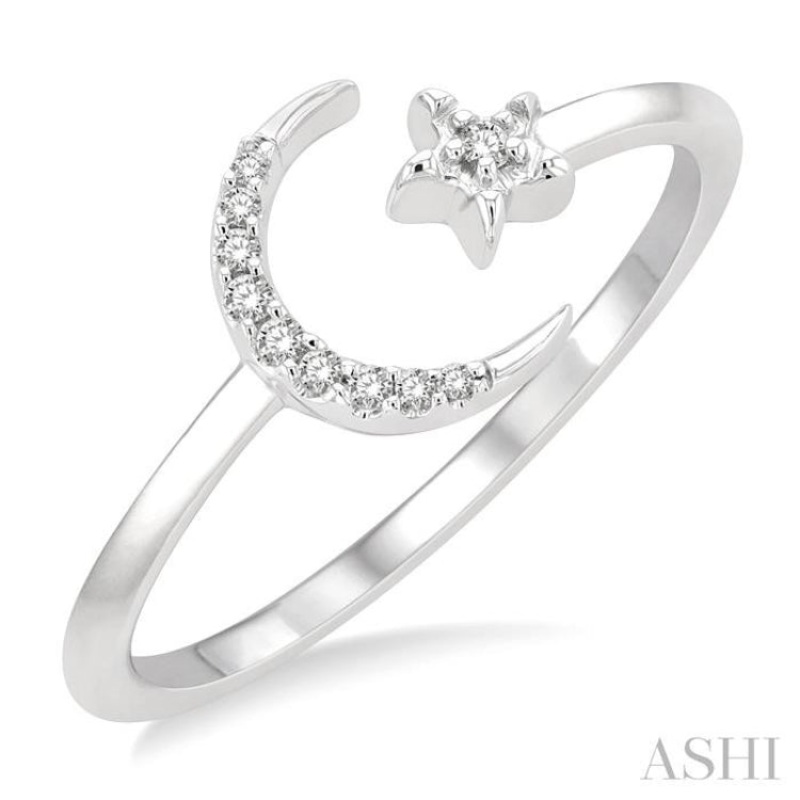 An auspicious symbol associated with a specific faith, the crescent and star sign is worn not only by followers of the religion but by others as well. Whatever be the reason, this diamond crescent and star stackable fashion ring from the petite collection makes a fine addition to the jewelry box. It features an open-ended center, with a crescent on one side and a star on the other end. A pave set round-cut diamond adorns the star center, while the plain tip crescent is embellished with 9 pave set round-cut diamonds. The Petite fashion ring is carved in a rhodium finish 10 karat white gold. Total diamond weight is 1/20 ctw.