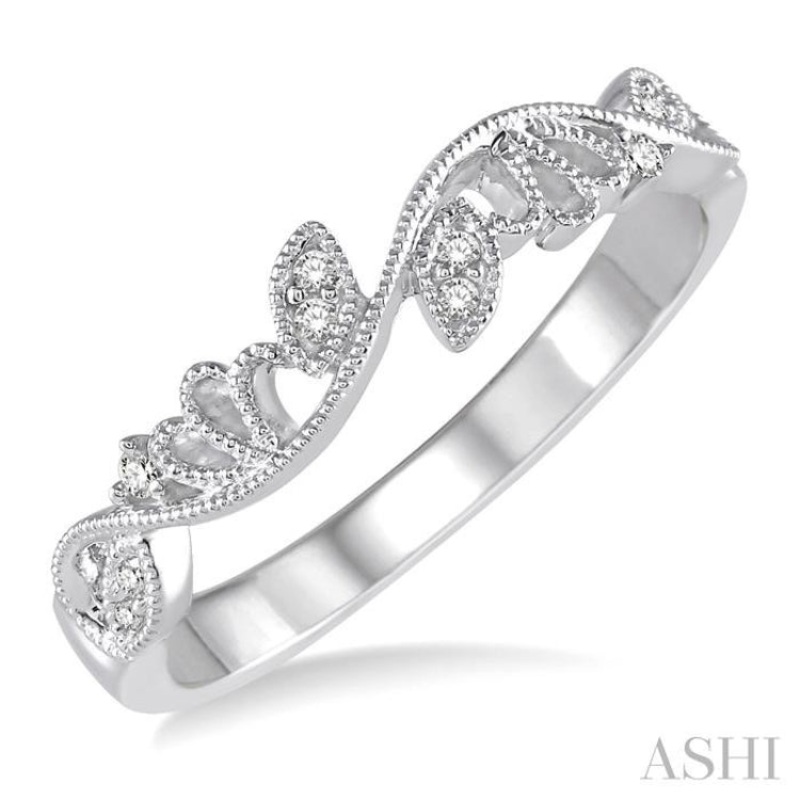 This dazzling Diamond Wedding Band packs a punch with its elegant nature inspired design and 10 magnificent round cut diamonds. These diamonds are cast in prong setting for an air of sophistication, and go all around the band complimenting the floral design. This ring is made in 14 karat White Gold with milgrain finish and normal polish. Total diamond weight is 1/20 Ctw.