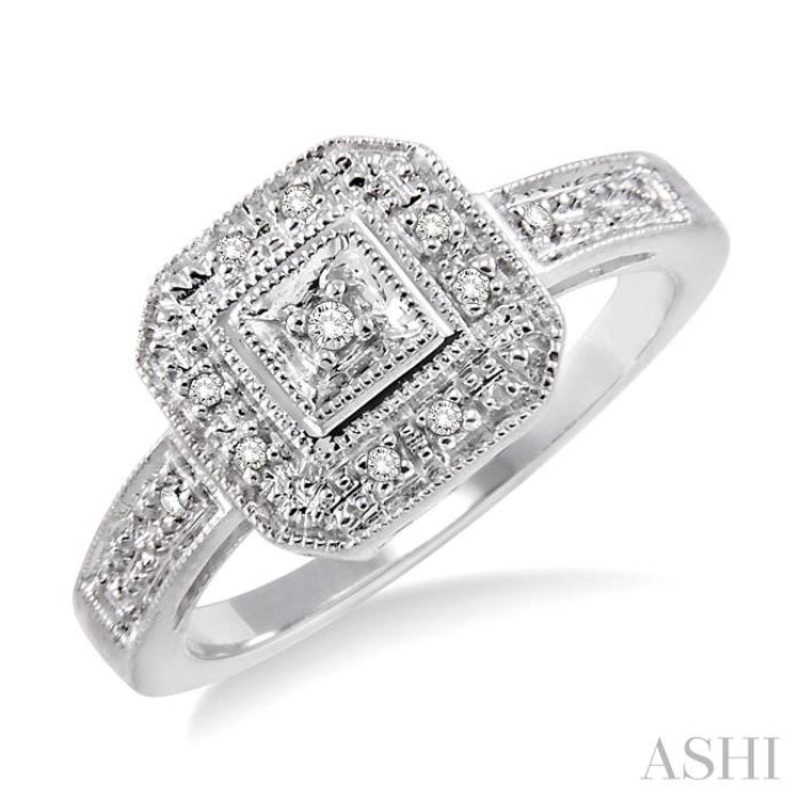 Enhance the glamour of your beloved’s style with this Vintage diamond ring. Fashioned in 10 karat gleaming white gold, the ring features 11 prong set sparkling single cut diamonds. Total diamond weight is 1/20 ctw.