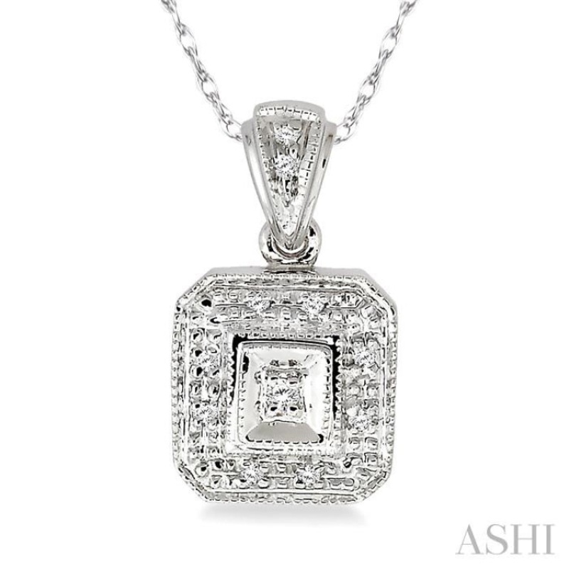 These attractive Vintage diamond pendant will adorn your look with a dash of sparkling elegance. Fashioned in luminous 10 karat white gold, this exquisite pendant is embellished with constellation of 11 prong set scintillating single cut diamonds and a beautiful Rope chain. Total diamond weight is 1/20 ctw.