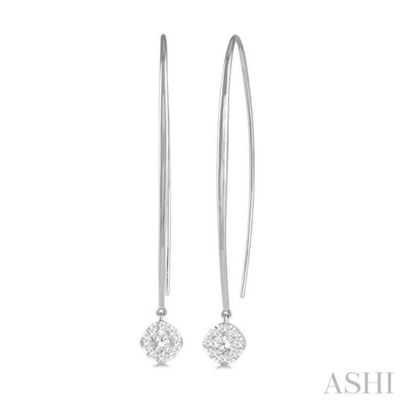 These Lovebright diamond earrings are delicate, yet so powerful that they draw instant attention. The tiny cushion shape mounts that suspend from fancy earwire closures are beautified by round cut diamonds. There are 9 invisible set round cut diamonds embellishing each mount, with one in the center and 8 diamonds forming a halo around it. Like every piece of jewelry in the Lovebright collection, this pair of earrings does not fail to impress either. The earring is crafted in 14 karat white gold. Total diamond weight is 1/3 ctw.