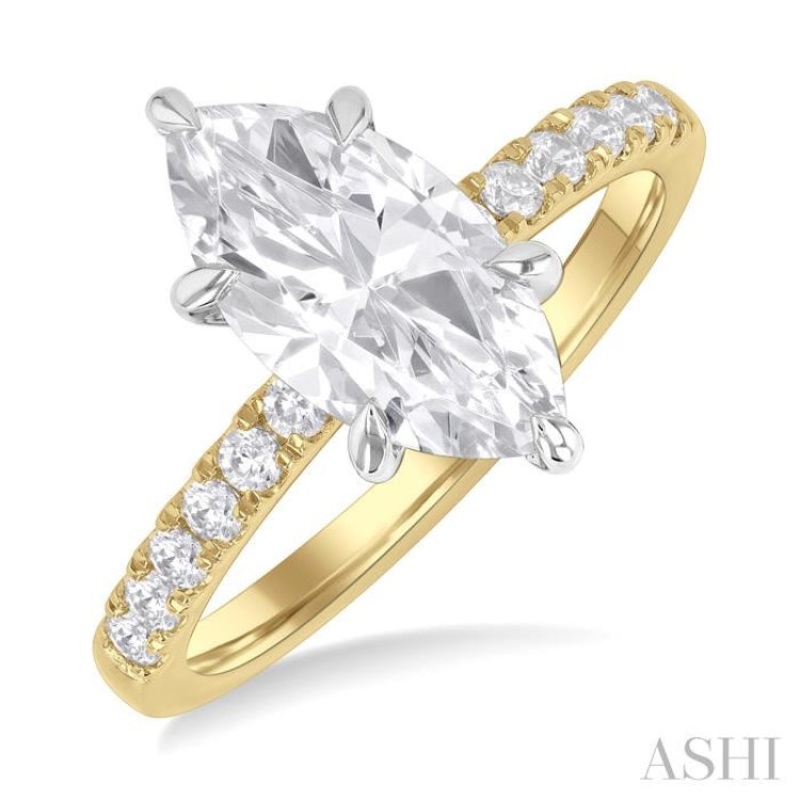 A stunning semi-mount diamond engagement ring, this is a perfect ring to take your love journey to the next level. Expertly crafted, the ring features a captivating prong-raised marquise-shaped white gold center mount, awaiting a center stone of your choice. Suiting your taste and budget, you can pick a marquise cut diamond ranging from 1.65 ctw to 2.35 ctw for the center mount. Since this is a semi-mount ring, it comes partly decorated, with the shank and gallery pre-embellished with diamonds. While 6 each, total 12, split prong set round cut diamonds adorn the shank, 14 split round cut diamonds accent the gallery area. The semi-mount engagement ring is styled in a rhodium finish 14 karat yellow and white gold. Total diamond weight is 1/3 ctw.