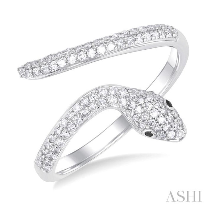 The serpent symbolizes wisdom, fertility, rebirth, purification, protection, healing, immortality, and eternal love. It has been depicted in jewelry in different cultures through the centuries and is still worn widely across the world. This diamond serpent ring from the season’s trending Petite Collection is a fine choice. It features a serpent, coiled into an open-ended ring, with the head turned out to the front and the tail outwards towards the back, on the ring top. 55 pave set round cut diamonds embellish the head, while 37 pave set round cut diamonds adorn the tail. 2 bezel set black diamonds make up the serpent eyes. The Petite serpent ring is carved in a rhodium finish 10 karat white gold. Total diamond weight is 1/3 ctw.