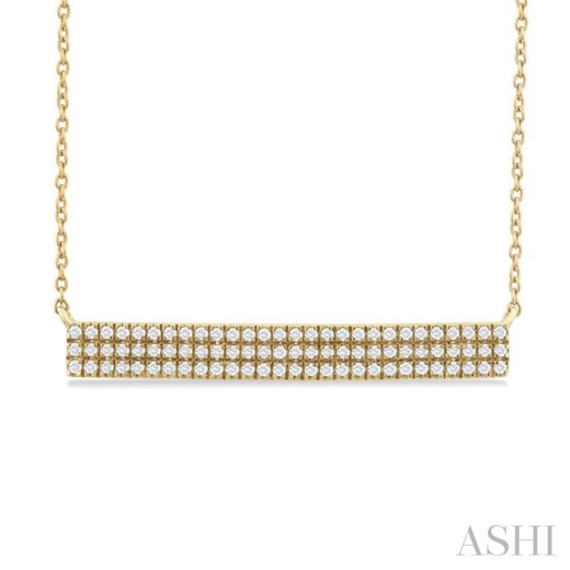 A refined diamond necklace, this captures attention with its simple yet sophisticated design. It features at the heart of the necklace, a bar-shaped centerpiece adorned with a triple row of luminous pave set round cut diamonds. A total of 84 diamonds shimmer across the bar, meticulously placed in three rows of 28 diamonds each. Completing the ensemble is a Chain25 link chain, with both bar pendant and chain crafted in 14 karat yellow gold. Total diamond weight is 1/4 ctw.