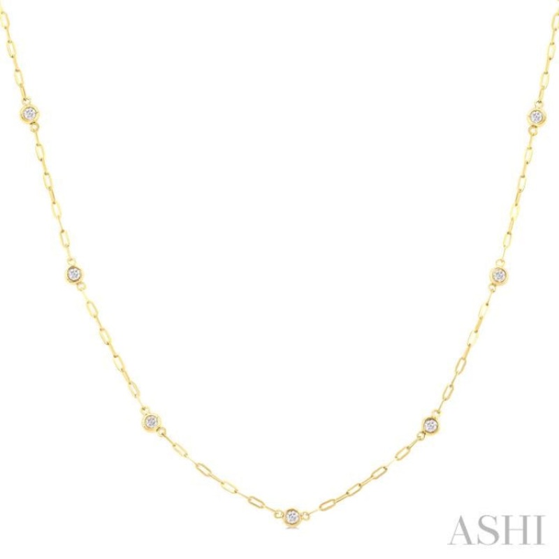 Whether worn alone for a chic look or layered with other necklaces for a more statement-making style, this diamond station necklace is sure to become a beloved staple in your jewelry collection, for effortless sophistication and modernity. It features a sleek design, with bezel set diamonds embellishing the stations along the chain, adding a touch of sparkle to it. The stunning necklace boasts a total of 13 bezel set round cut diamonds, each carefully placed along the 18-inch 1.50MM paper clip chain, creating a captivating and eye-catching look. Designed in a polished finish 14 karat yellow gold, this diamond necklace is a must-have. Total diamond weight is 1/4 ctw.