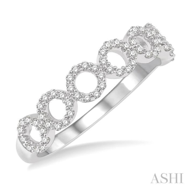 This is a simple but attractive diamond stackable band, and as its name suggests, it can be worn with other bands for a more showy look. However, you can choose to wear it by itself, as it offers enough appeal of its own. The fashion ring features 7 circular accents that join to form a neat row, ending at the shank. These circular accents are adorned with a total of 70 prong set round cut diamonds, 10 on each accent. The stackable band is framed in 10 karat white gold. Total diamond weight is 1/4 ctw.