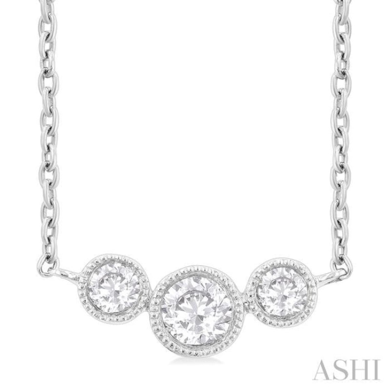 Discover the timeless symbolism of love with this dainty diamond necklace, a meaningful representation of enduring love and commitment. It is perfect for celebrating milestones or as a heartfelt gift that captures the essence of cherished memories. The necklace features a triple circular mount design, symbolizing the journey of a couple’s relationship through the past, present, and future. At the heart of the piece, a 1/6 ctw bezel set round cut diamond represents the present, flanked by a 1/20 ctw bezel set round cut diamond each, symbolizing the past and future of the couple’s love story. A delicate milgrain border enhances the beauty of the diamonds. The necklace is completed with a Cat-25 chain and secured by a lobster clasp closure. It is crafted in a polished rhodium finish 14 karat white gold. Total diamond weight is 1/4 ctw.