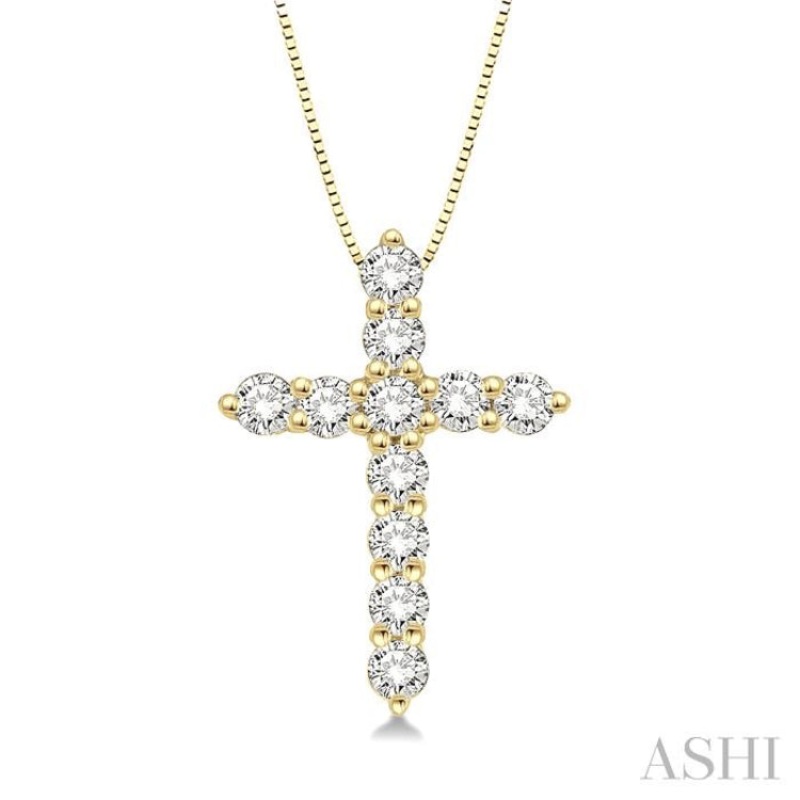 Honor your commitment to faith & belief with this divine diamond cross pendant. Styled in 14 karat lustrous yellow gold, this attractive cross pendant is embellished with 11 radiant bezel set round diamonds. This pendant hangs up from a beautiful Rope chai