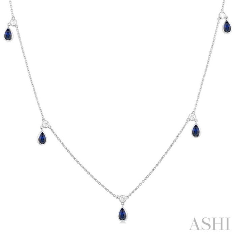 An intricate precious gemstone station necklace, this offers instant appeal. It is dainty,elegant and dressy, making it a quick buy for many. The station necklace features a bezel set round cut diamond, total 5, placed at certain intervals along the necklace. Each of these bezel set diamonds, suspends a 5X3MM pear cut sapphire under it, total 5. The precious station necklace is an 18-inch Cat Chain. It is fashioned in a polished rhodium finish 14 karat white gold. Total diamond weight is 1/4 ctw.