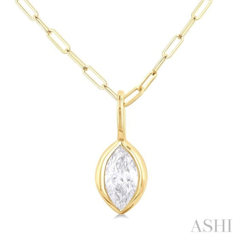 Simple but attractive, this diamond fashion pendant is the perfect accessory to stylishly adorn any neckline. It showcases a dazzling marquise cut diamond, bezel set within the marquise mount pendant, exuding sophistication and charm. Suspended from a loop