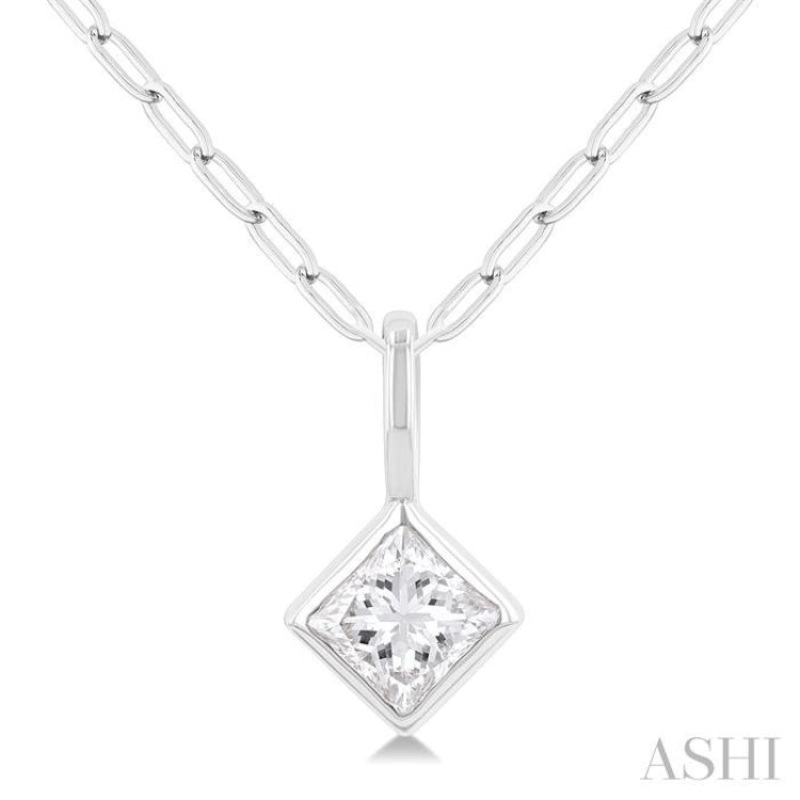 1/5 ctw Princees Cut Bezel Set Diamond Fashion Pendant With Paper Clip Chain in 14K White Gold