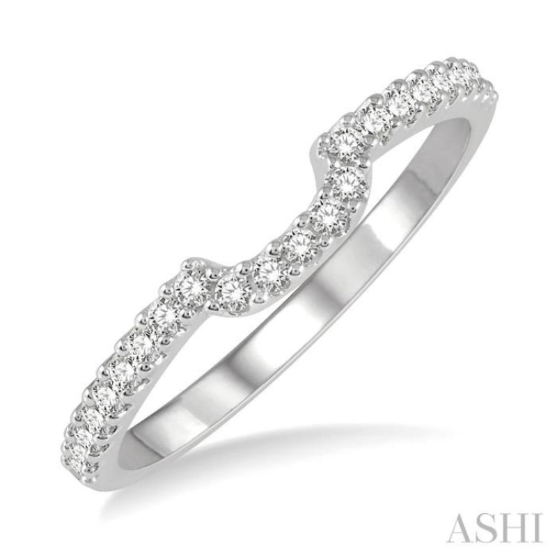 Wedding bands like these, with indented center, are designed for a dual purpose. You can choose to wear them on their own or alongside a mounted engagement ring that has a similar shape center mount. This one goes well with round and oval shape mount rings, as they fall neatly in place together. It features a u-shape center that gives it an attractive look, so that even when its worn by itself, it offers a stylish finish. The wedding band is embellished with 23 prong set round cut diamonds that line the center and the shank, styled in 14 karat white gold. Total diamond weight is 1/5 ctw.