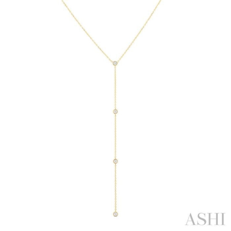 Whether wearing for a formal occasion, or adding a bit of sparkle to your everyday look, this diamond lariat necklace makes for a refined addition to your jewelry collection. The necklace features a captivating Y-shape design, highlighted by bezel set round cut diamonds that gracefully suspend from the center in a vertical row. 4 bezel set round cut diamonds are strategically placed along the stations of the drop, starting with the diamond at the center of the necklace. Completing this elegant necklace is a Catchain25 Spool, all styled in 14 karat yellow gold. Total diamond weight is 1/6 ctw.