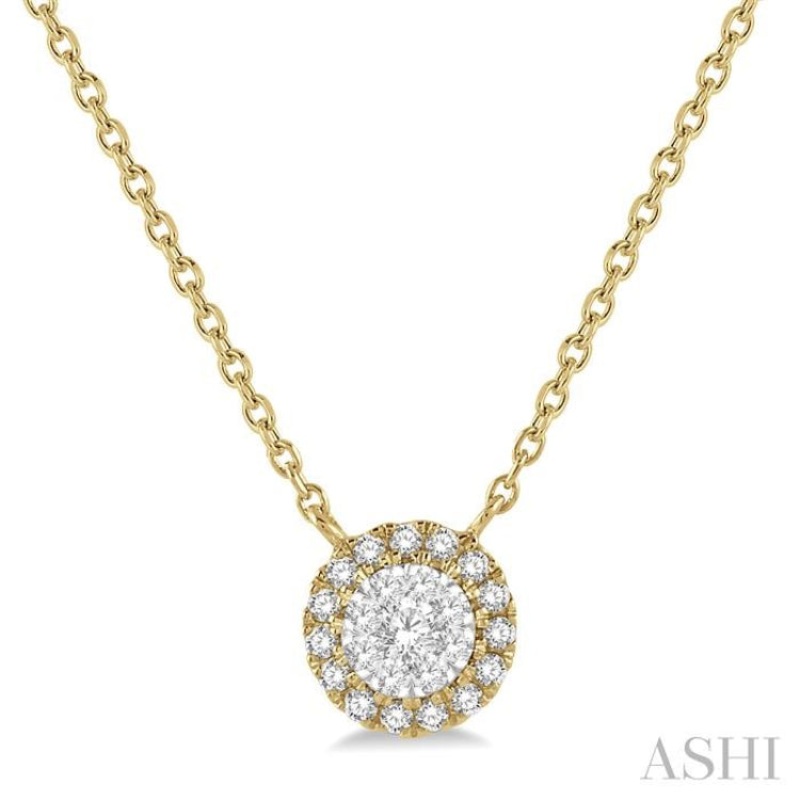 A pretty Lovebright diamond necklace, this makes a fine addition to one’s collection. It features a circular necklace that displays a white gold center mount and a yellow gold border around it. The center mount is embellished with an invisible set round cut diamond in the middle, haloed by 8 invisible set round cut diamonds. Adorning the yellow gold border trim are 15 pave set round cut diamonds. An 18-inch CAT25 chain with a lobster lock completes the necklace. While the necklace is styled in 14-karat yellow and white gold, the chain is framed in 14-karat yellow gold. The total diamond weight is 1/6 ctw.