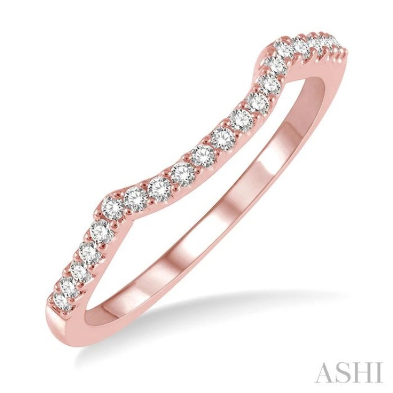A dainty and elegant diamond wedding band in beautiful rose gold. The band features a crescent shaped center with diamonds decorating it and the shank, offering an eye-catching look to the ring. There is a total of 21 prong set round cut diamonds embellishing the band, adding a sparkling touch to the rose gold body. The wedding band is fashioned in a polished finish 14 karat rose gold. Total diamond weight is 1/6 ctw.
