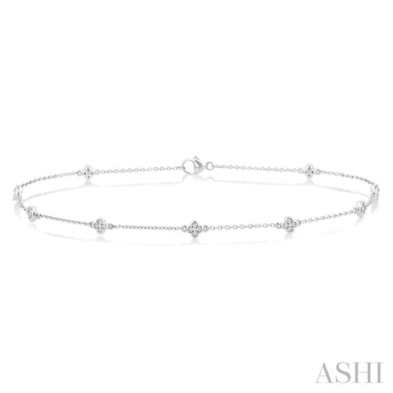 A radiant symbol of luck and prosperity, the four-leaf clover is widely used in jewelry-making. You too can embrace the charm and symbolism of the four-leaf clover with this dainty diamond station anklet, designed to adorn your ankle with a touch of whimsy and sparkle. The anklet features along each station of the delicate CAT30/25 Cat Chain, a dainty four-leaf clover motif adorned with round cut diamonds. There are 9 clover motifs, each embellished with 4 prong set round cut diamonds, a total of 36 diamonds in all. A lobster clasp closure secures the diamond station anklet, which is molded in a rhodium finish 10 karat white gold. Total diamond weight is 1/6 ctw.