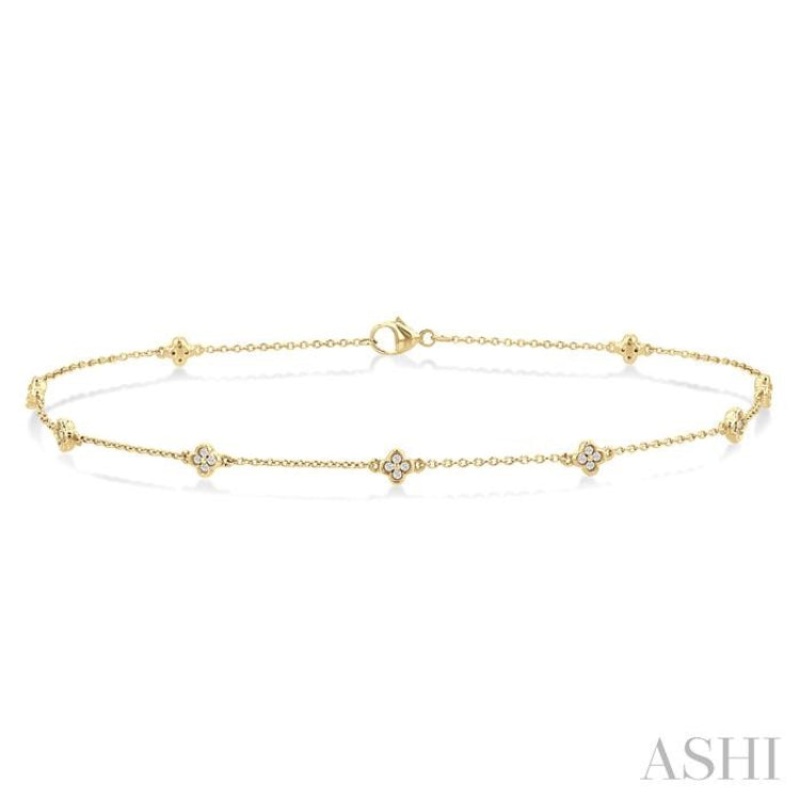 A radiant symbol of luck and prosperity, the four-leaf clover is widely used in jewelry-making. You too can embrace the charm and symbolism of the four-leaf clover with this dainty diamond station anklet, designed to adorn your ankle with a touch of whimsy and sparkle. The anklet features along each station of the delicate CAT30/25 Cat Chain, a dainty four-leaf clover motif adorned with round cut diamonds. There are 9 clover motifs, each embellished with 4 prong set round cut diamonds, a total of 36 diamonds in all. A lobster clasp closure secures the diamond station anklet, which is molded in 10 karat yellow gold. Total diamond weight is 1/6 ctw.