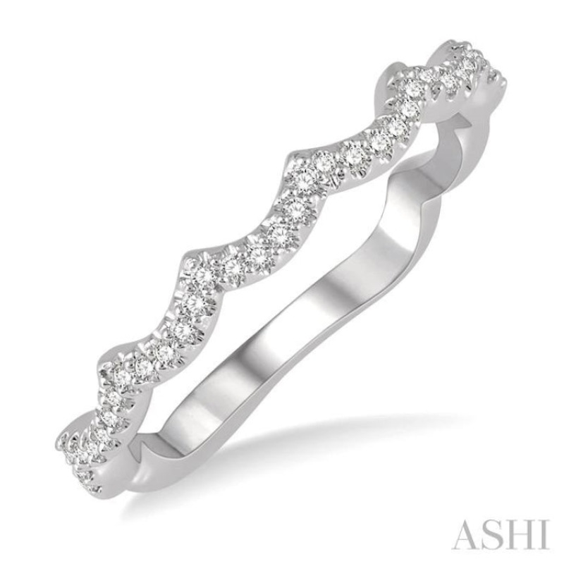 A well-cut wavy pattern wedding band, this offers beauty and sophistication to your bridal attire. The lattice waves, besides providing an exclusive look, come embellished with round cut diamonds. There is a total of 38 prong set round cut diamonds encrusting the wave pattern, offering the design prominence. You can even wear this ring alongside an engagement ring that comes with a similar wavy pattern, allowing them to fit in together. The elegantly stylish wedding band is designed in rhodium finish 14 karat white gold. Total diamond weight is 1/6 ctw.