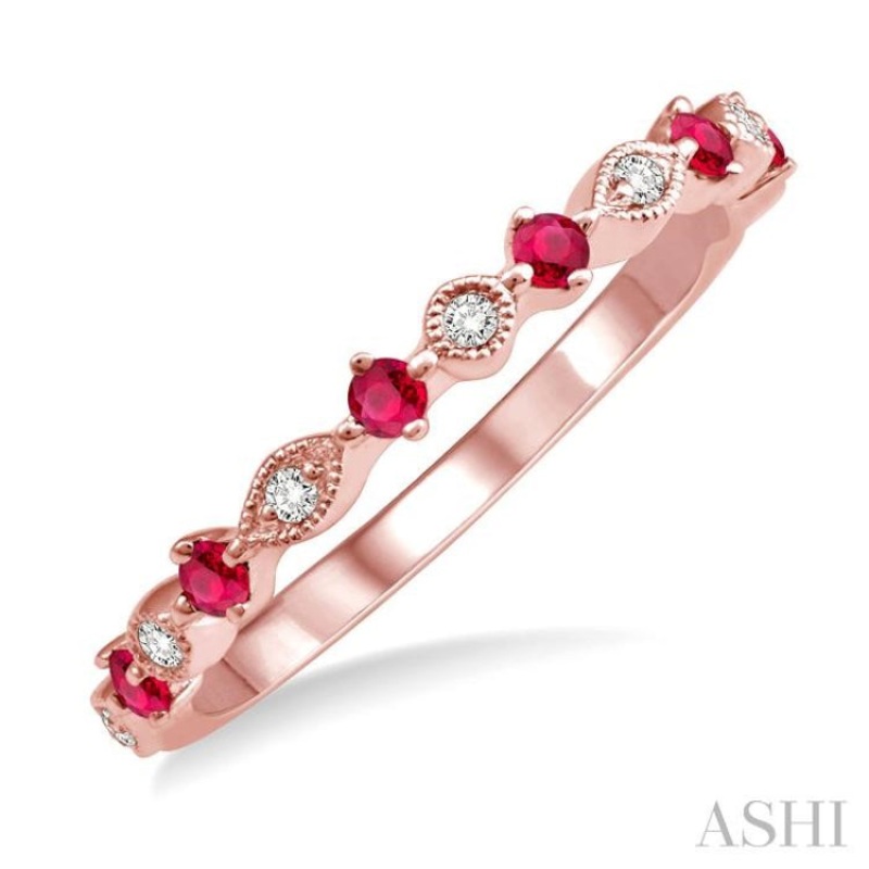 Give her more reasons to feel proud of your exquisite taste by surprising her with this tantalizing Ruby and diamond band. Crafted in precious 14 karat rose gold, the band features 13 Ruby and diamond alternately prong and bezel set gemstones in milgrain finished. Total diamond weight is 1/20 Ctw and Ruby measures 1.80 MM.