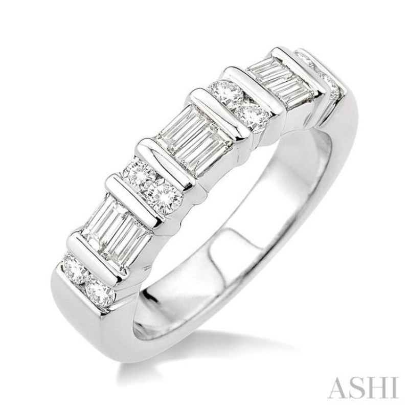 A gorgeous diamond fashion band, this catches the eye without fail. Its fabulous setting that is simple yet so starkly impressive, makes it a desirable piece. The fashion band features an attractive layout of baguette and round cut diamonds. There are 6 fancy set baguette diamonds, paired in 3 parallel rows, which is segregated by a pair of channel set round cut diamonds, a total of 8 diamonds, 2 each between each baguette row. The pattern thus created is quite stunning. The fashion band is sculpted in 14 karat white gold. Total diamond weight is 1 ctw.