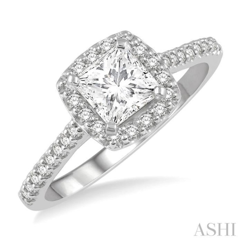 Looking for a diamond engagement ring that looks stunning? Then this ring might just be what you need. It features a cathedral shank, upon which nestles a cushion shape center mount. This is embellished with a 3/4 ctw princess cut diamond in the center, surrounded by round cut diamonds. There is a total of 24 prong set round cut diamonds haloing the center stone. 6 each prong set round cut diamonds, total 12, accentuate the shank on either side. The diamond engagement ring is crafted in a rhodium finish 14 karat white gold. Total diamond weight is 1 ctw.