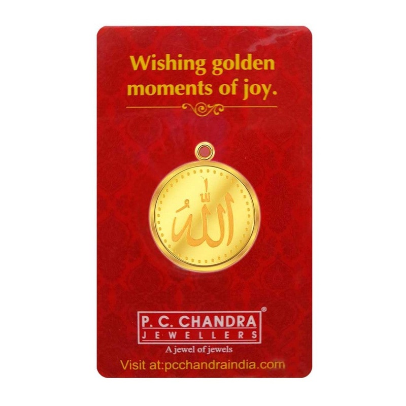 Adorn the almighty Allah ,written with arabic script made up with pure gold in a coin shape. This auspicious Allah sign gold coin pendant comes with 10 gm weight and it bears BIS hallmark certification to confirm it’s purity.