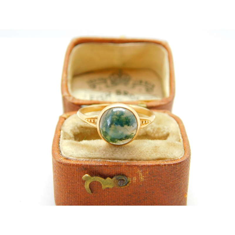 Details: A fantastic and wonderfully designed antique art deco 10ct yellow gold cabochon moss agate dress ring stamped '10k' to the interior band c1930. This is a wonderful item that would make a perfect gift or addition to any collection. The BOX pictured