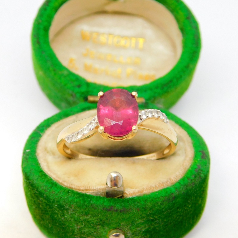 Details: A fantastic and wonderfully designed vintage 10ct yellow gold dress ring set with central pink topaz flanked with smaller diamonds hallmarked London 1992 to the interior. This is a wonderful item that would make a perfect gift or addition to any c
