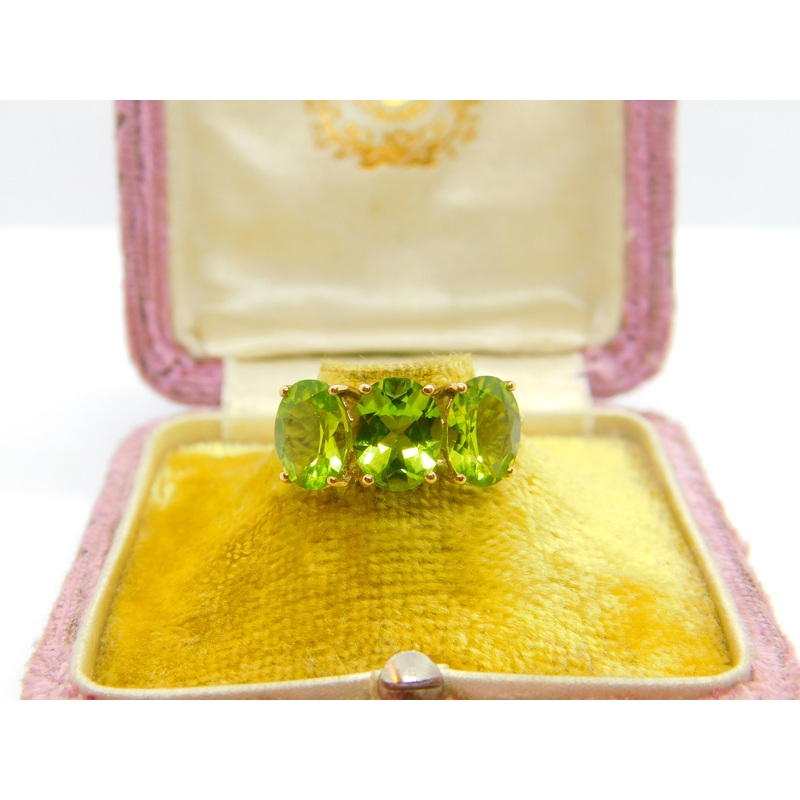 Details: A fantastic and wonderfully designed vintage 10ct yellow gold and three stone peridot band ring with lovely detailing hallmarked 10k to the inner band c1990. This is a wonderful item that would make a perfect gift or addition to any collection. The BOX pictured is for PRESENTATION ONLY and is NOT included in the listings but used to frame the pictures unless specifically stated otherwise.