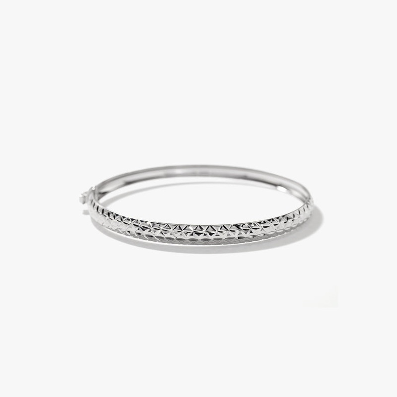Dazzle effortlessly with this 10K white gold diamond-cut dome flex bangle, designed to merge contemporary elegance with timeless charm. Featuring a refined 65x56mm silhouette, this bracelet offers a graceful fit that radiates understated luxury.The intricate diamond-cut detailing transforms light into a cascade of brilliance, making every movement a show-stopping moment. Its dome shape adds depth and dimension, while the cool luster of white gold enhances its modern allure.Whether worn solo to showcase its unique brilliance or paired with other pieces for a layered look, this bangle is a versatile addition to your jewelry collection.