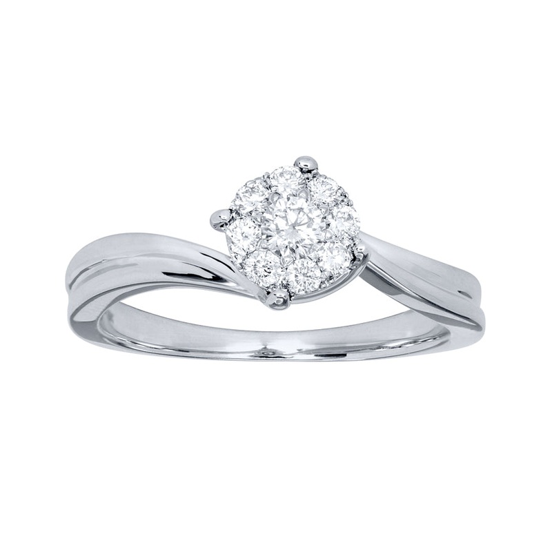 A brilliant look that is as special as she. Wonderfully crafted in 10K white gold, this spendid ring offers a total diamond weight of 0.25 carats. A 0.11 carat round centre diamond is tastefully accented by an additional 8 accent diamonds.