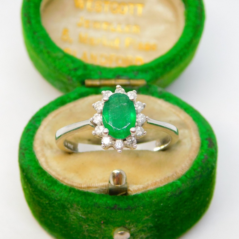 Details: A fantastic and wonderfully designed vintage 14ct white gold floral engagement ring set with a central 0.5ct emerald with beautiful colour and clarity flanked by twelve smaller diamonds hallmarked to the interior band c1980, the stones has been te