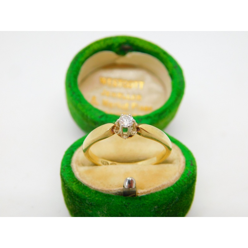 Details: A fantastic and wonderfully designed vintage 14ct yellow gold solitaire dress ring set with a central 0.1ct cushion cut diamond hallmarked to the interior c1970. This is a wonderful item that would make a perfect gift or addition to any collection. The BOX pictured is for PRESENTATION ONLY and is NOT included in the listings but used to frame the pictures unless specifically stated otherwise.