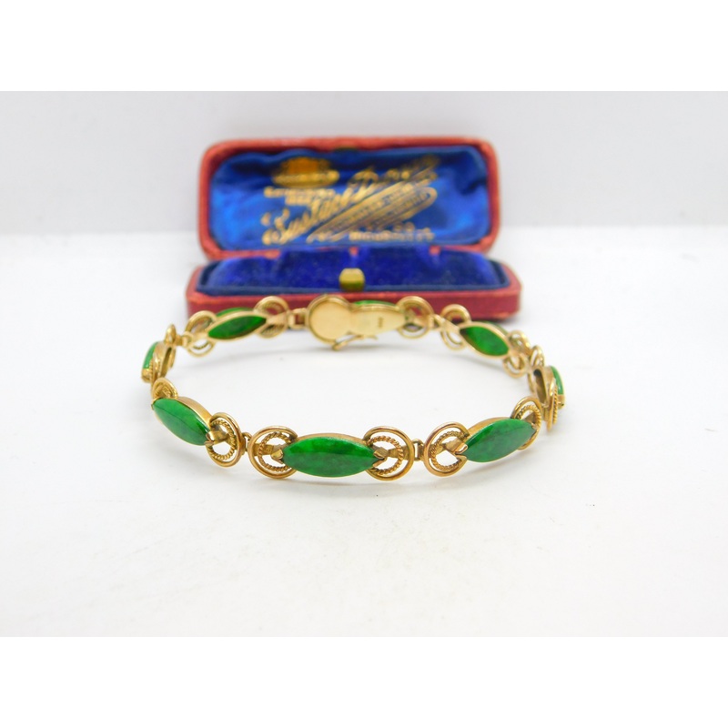 Details: A fantastic and wonderfully designed antique art deco 14ct yellow gold panel bracelet in rope twist form set with deep green jade c1940 hallmarked 14k to the bale. This is a wonderful item that would make a perfect gift or addition to any collection. The BOX pictured is for PRESENTATION ONLY and is NOT included in the listings but used to frame the pictures unless specifically stated otherwise.