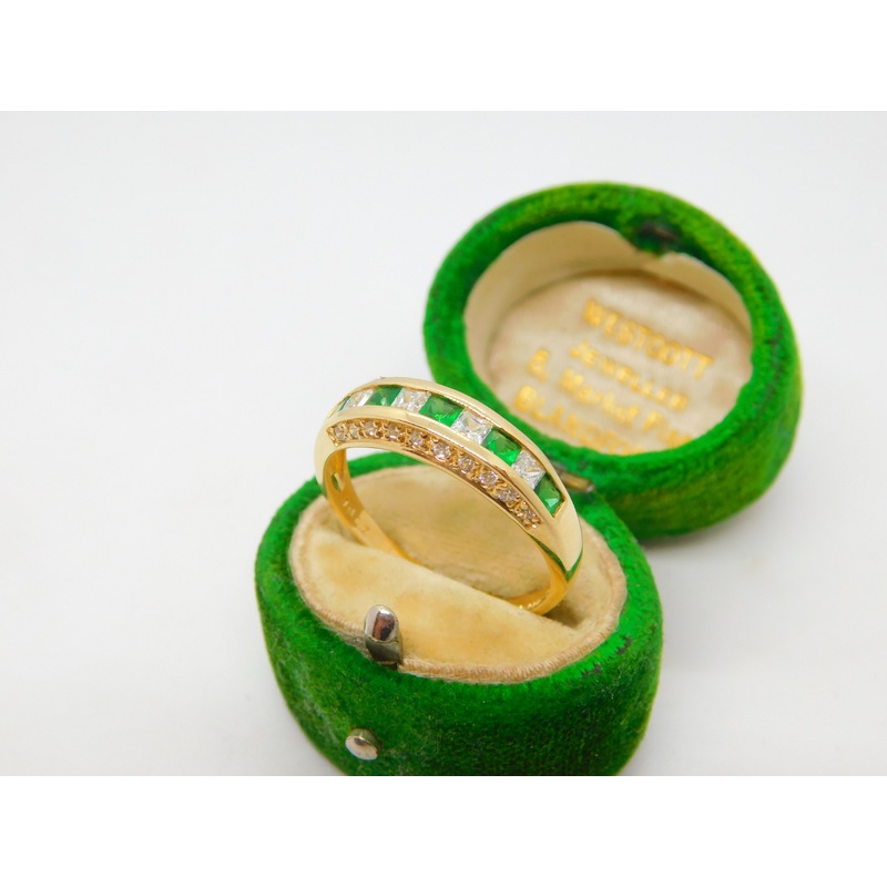 Details: A fantastic and wonderfully designed vintage 14ct yellow gold boat ring set with green and white paste hallmarked London 1999 to the interior band. This is a wonderful item that would make a perfect gift or addition to any collection. The BOX pict