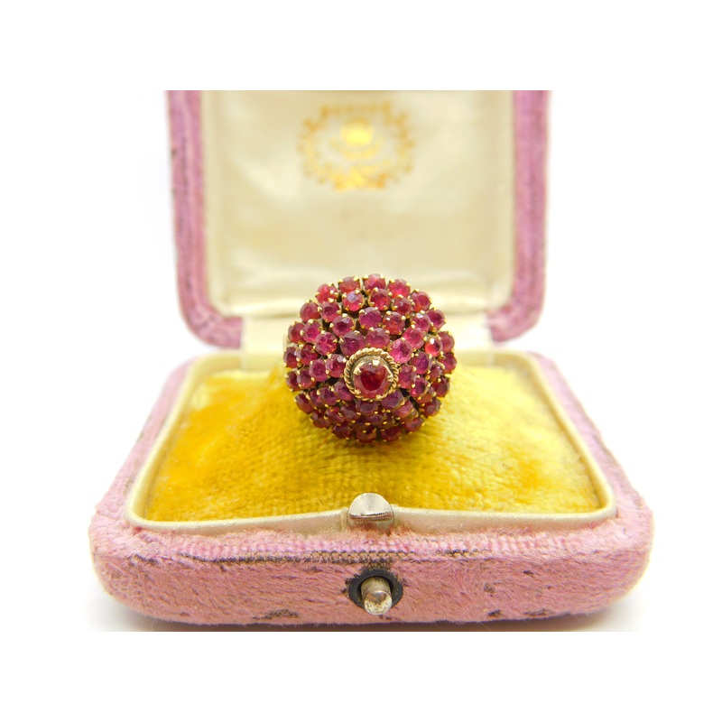 Details: A fantastic and wonderfully designed antique art deco 14ct yellow gold pagoda or floral cluster ring set with natural rubies throughout hallmarked 14K to the interior band c1930. The stones have been tested. This is a wonderful item that would make a perfect gift or addition to any collection. The BOX pictured is for PRESENTATION ONLY and is NOT included in the listings but used to frame the pictures unless specifically stated otherwise.